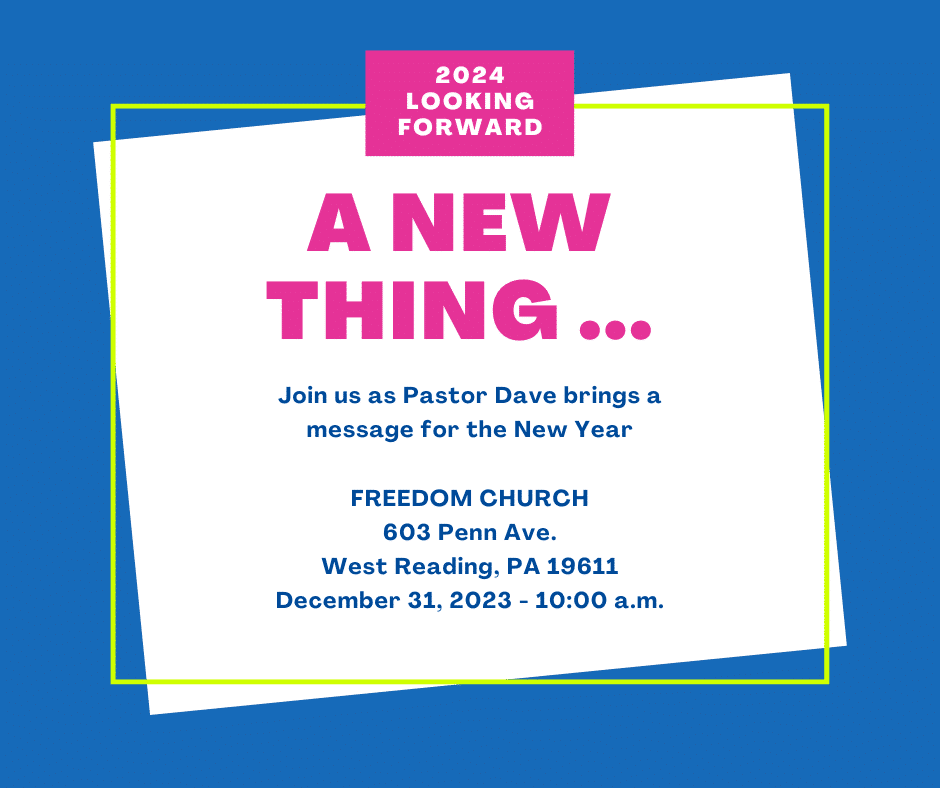 Rev. Dave, Laurel Mountain Ministries’ Executive Director, brings the New Year’s message for Freedom Church at 603 Penn Avenue in West Reading, PA 19611. The service starts at 10:00 a.m. and is preceeded by a walk-in light breakfast and coffee. The Freedon Church Praise Band will lead in dynamic and spiritual worship. Please plan to join Rev. Dave on New Years Eve Morning.