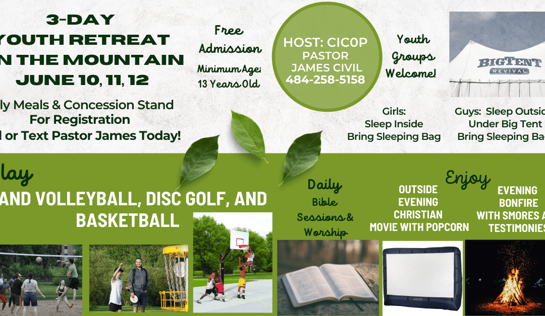 Day One CICOP Youth Retreat – Itinerary Reveille Session One: 10 -12 pm – Breakfast and “Let’s Talk About Discipleship” Session Two: 12 – 3 pm – Recreation “It’s Time to Play” Session Three:  3 – 5 pm...